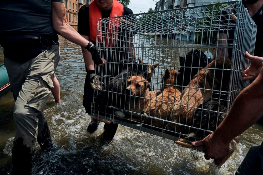 Volunteers carry a cage with dogs evacuated from a flooded neighbourhood in Kherson, Ukraine, Thursday, June 8, 2023. Floodwaters from a collapsed dam kept rising in southern Ukraine on Thursday, forcing hundreds of people to flee their homes in a major emergency operation that brought a dramatic new dimension to the war with Russia, now in its 16th month. (AP Photo/Libkos)