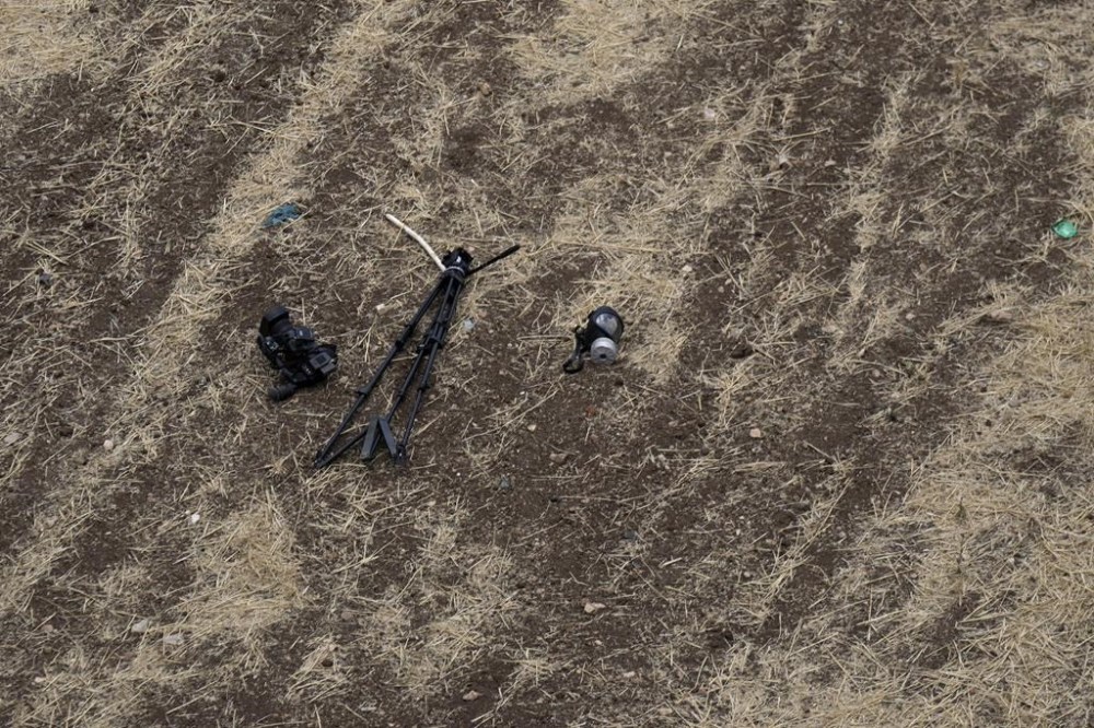 A camera, gas mask and tripod belonging to a Palestinian journalist injured when he was shot while filming fighting between Israeli forces and Palestinian militants in the West Bank city of Jenin, Monday, June 19, 2023. Israeli helicopter gunships struck targets in the West Bank, during a fierce gunbattle in which Palestinian militants detonated a roadside bomb next to an Israeli military vehicle. At least four Palestinians, including a 15-year-old boy, were killed. Twenty-nine Palestinians were wounded and the Israeli military said seven members of the border police and the army were hurt. They said troops came under fire during an arrest raid in Jenin and shot back at gunmen. (AP Photo/Majdi Mohammed)