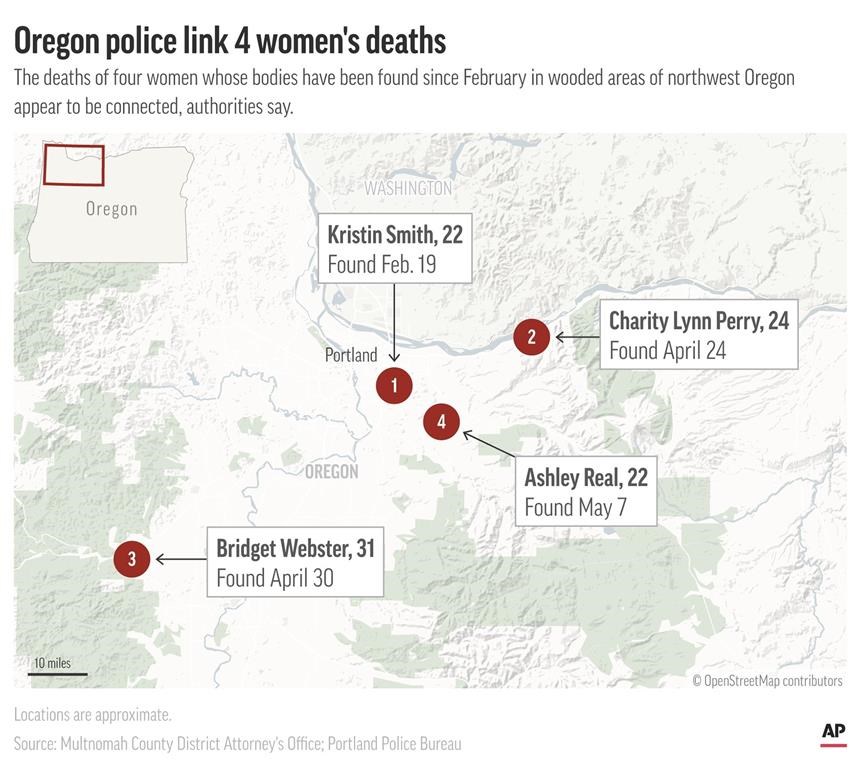 The women’s bodies were found in Portland and rural areas starting on Feb. 19, with the latest one found on May 7. One body was found about 45 miles (72 kilometers) southwest of Portland, near a creek in Polk County.