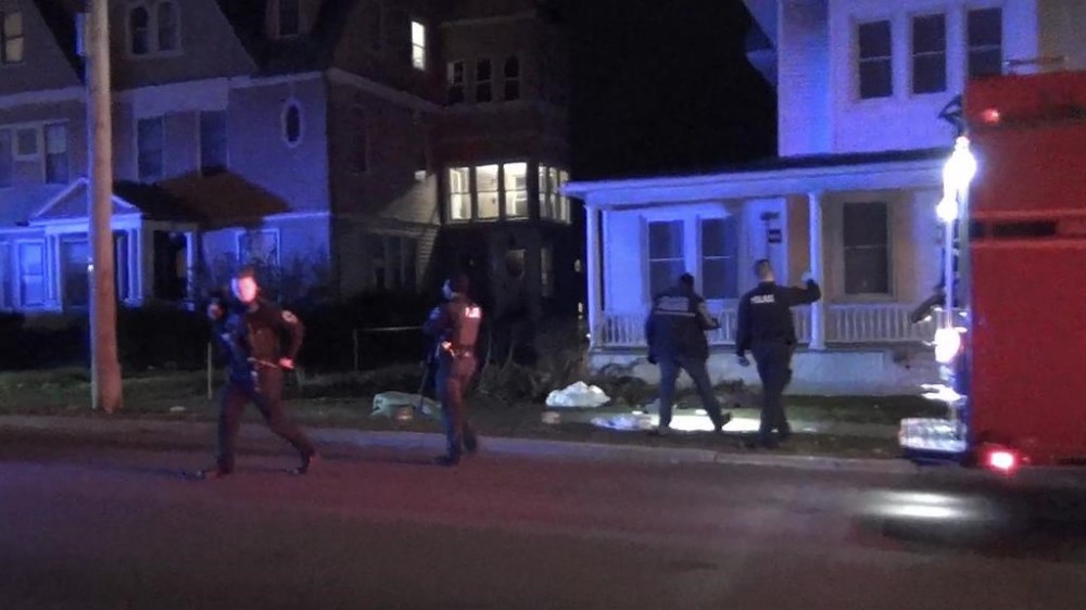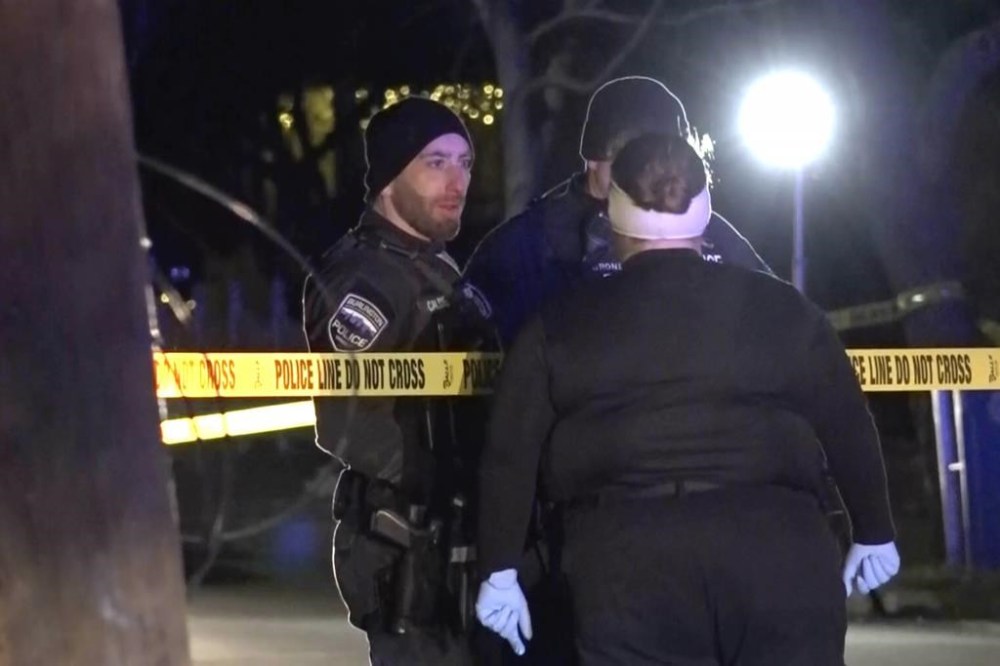 In a still frame from video law enforcement officers investigate the scene of a shooting, Saturday, Nov. 25, 2023, in Burlington, Vt. Burlington Police Department arrested Jason J. Eaton, suspected in the shooting of three young men of Palestinian descent, who were attending a Thanksgiving holiday gathering near the University of Vermont campus Saturday evening. (Wayne Savage via AP)