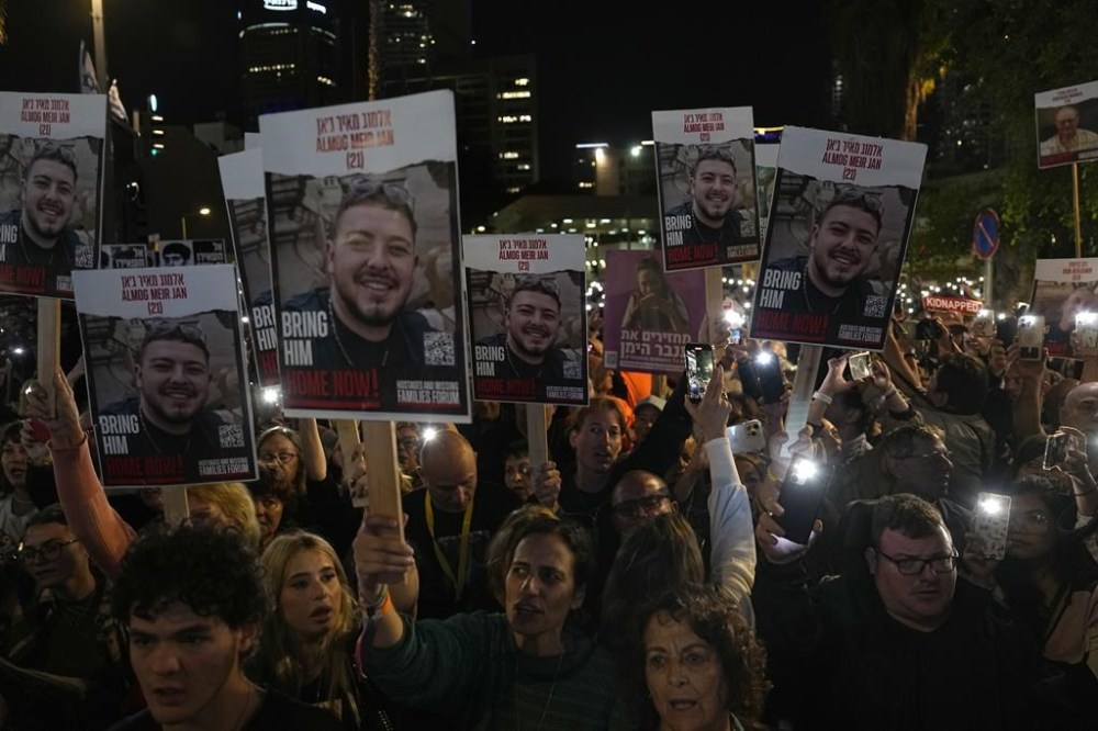 Relatives and friends of hostages held in the Gaza Strip by the Hamas militant group call for their release in the Hostages Square at the Museum of Art in Tel Aviv, Israel, Saturday Dec. 2, 2023. (AP Photo/Ariel Schalit))