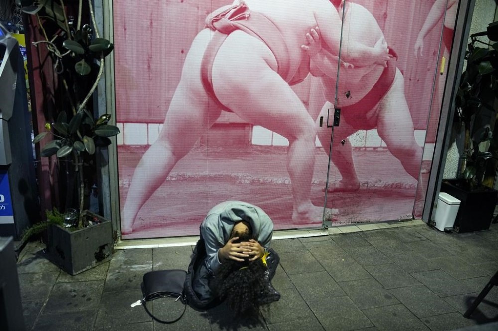 A woman takes cover as a a rocket warning siren sounds during a a demonstration to call for the release of Hamas hostages in front the Museum of Art in Tel Aviv, Israel, Saturday Dec. 2, 2023. (AP Photo/Ariel Schalit)