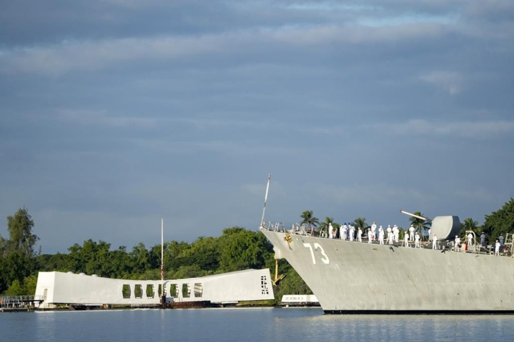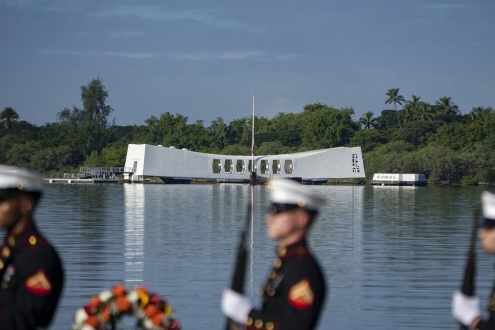 Thursday’s ceremony was held on a field across the harbor from the USS Arizona Memorial, a white structure that sits above the rusting hull of the battleship, which exploded in a fireball and sank shortly after being hit. More than 1,100 sailors and Marines from the Arizona were killed and more than 900 are entombed inside.