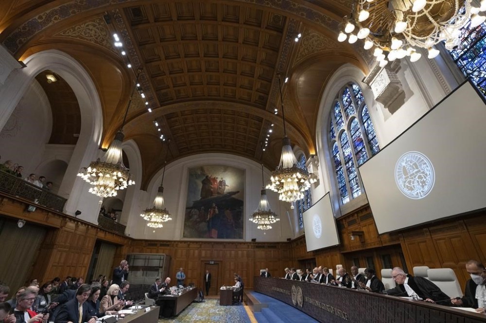 A view of the United Nations top court during the ruling in The Hague, Netherlands, Wednesday, Jan. 31, 2024, in a case in which Ukraine, front bench left, accuses Russia, front bench rear, of bankrolling rebels in 2014 and discriminating against Crimea's multiethnic community since its annexation of the region. It is the first of two decisions by the International Court of Justice linked to the decade-long conflict between Russia and Ukraine that exploded into a full-blown war nearly two years ago. (AP Photo/Peter Dejong)