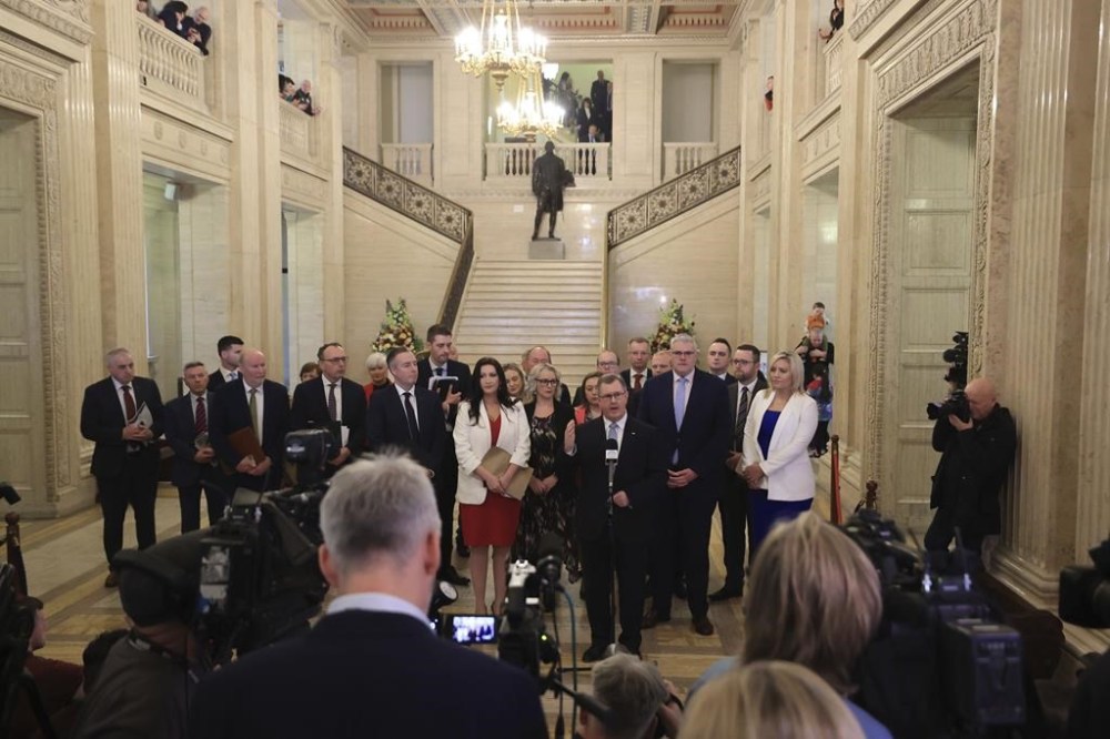 DUP leader Sir Jeffery Donaldson with Emma Little-Pengelly and his party's MLA's speaks to the media in the Great Hall at Parliament Buildings at Stormont, in Belfast, Saturday, Feb. 3, 2024. An Irish nationalist has made history by becoming Northern Ireland's first minister. Sinn Fein Vice President Michelle O’Neill was nominated Saturday as first minister as the government returned to work after a two-year boycott by unionists. (Oliver McVeigh/PA via AP)