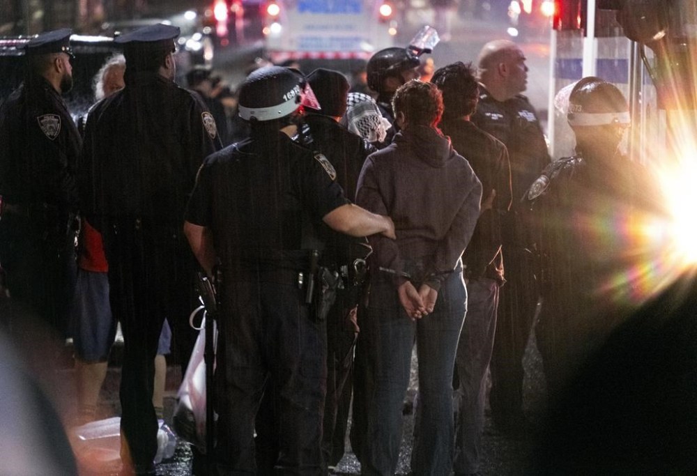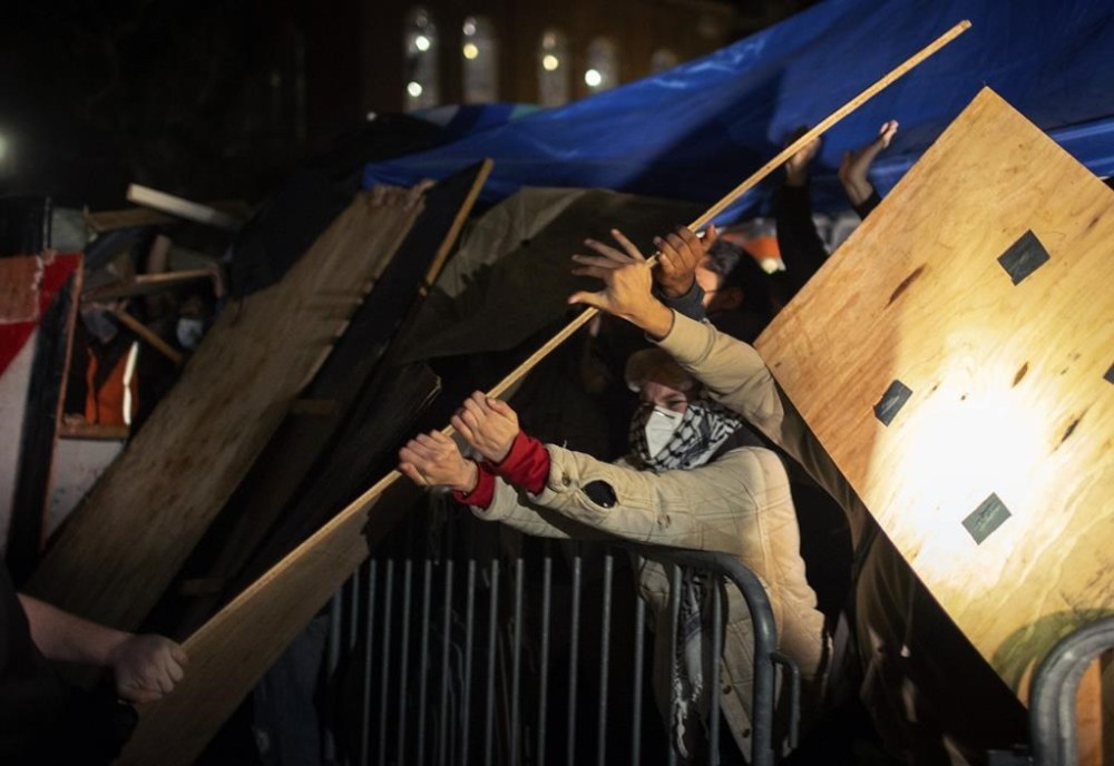 Police left the scene around 11:30 p.m., and police in riot gear showed up at 1:45 a.m. to establish a perimeter. Pro-Israel protesters threw traffic cones and chairs, released pepper spray, and tore down barriers around the encampment. Some from the pro-Palestinian camp hopped over the barriers and scuffled with the counter-protesters.