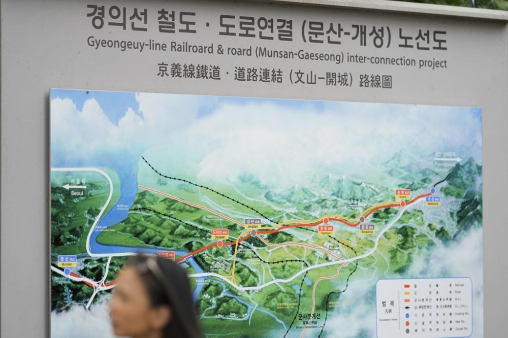 A visitor walks by a map of railroad and road between two Koreas cities, South's Munsan and North's Kaesong, at the Imjingak Pavilion in Paju, South Korea, Tuesday, Oct. 15, 2024. (AP Photo/Lee Jin-man)