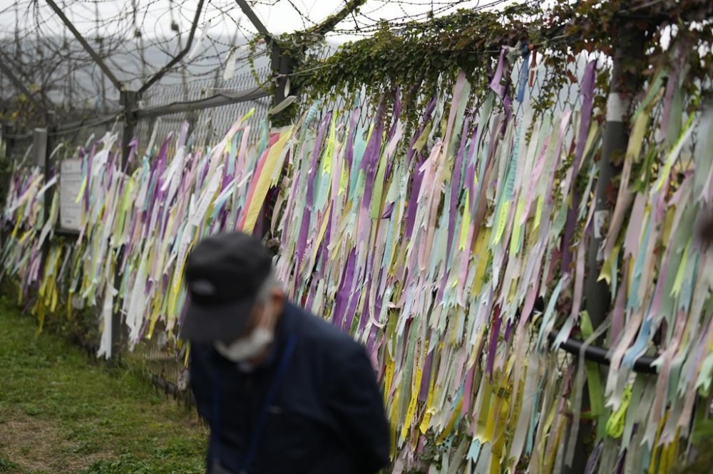 A visitor walks near a wire fence decorated with ribbons written with messages wishing for the reunification of the two Koreas at the Imjingak Pavilion in Paju, South Korea, Tuesday, Oct. 15, 2024. (AP Photo/Lee Jin-man)