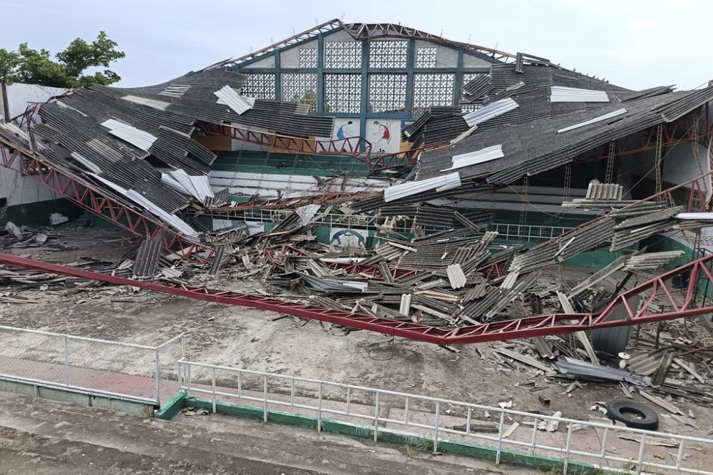 The Ricardo Plaza Coliseum is partially collapsed after an earthquake in Esmeraldas, Ecuador, Friday, April 25, 2025. (AP Photo/Jorge Demera)